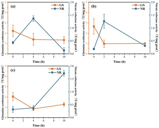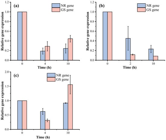 In group 1, the activity of NR was 0.43 U/mg prot at 0 h, after which it increased first. The activity of GS at 0 h was 2.22 U/mg prot, which decreased significantly and remained at approximately 1.3 U/mg prot from 4~10 h (Figure 7a). This was related to nutrient consumption, and the activities of the two enzymes decreased when nutrients were almost exhausted at the late stage of the experiment. Their expression levels were downregulated at 4 h, and both the NR and GS gene expression levels were upregulated at 10 h (Figure 8a). In group 2, the activity of NR tended to increase. After 2 h, the change in activity was small; it remained at approximately 0.31 U/mg prot and subsequently showed a downward trend (Figure 7b). In group 2, the NR and GS gene expression levels were downregulated (Figure 8b). In group 3, the activity of NR increased significantly to 1.72 U/mg prot at 10 h. The activity of GS at 0 h was 2.04 U/mg prot after which it decreased first (Figure 7c). The gene expression level of GS and NR also tended to first decrease and then increase, reaching the highest relative expression level at 10 h (Figure 8c).