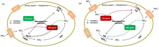 Nitrogen (N) metabolism is one of the basic physiological metabolic processes in plants and is completed by the catalysis of enzymes. Phytoplankton can reduce NO3− and NH4+ to amino acids through the action of nitrogen-metabolizing enzymes and utilize these amino acids (Figure 9) [38]. Since the uptake and assimilation of NO3− require a two-step reductase process, NO3− requires much more energy than NH4+, so most algae may preferentially use NH4+ as N to conserve energy [17]. Algal cells can utilize different forms of nutrients by regulating the activities of GS, NR, and other enzymes. The presence of NH4+ stimulates the GS gene and the activities of glutamine synthetase so that algal cells can assimilate and utilize NH4+. NO3− is also an environmental signal that regulates many processes, such as gene expression [39]. Cells can sense and respond to environmental concentrations of NO3− through nitrate (NO3−) transporters. For example, Arabidopsis thaliana acts as an ion sensor through the parental and receptor capacity of the nitrate (NO3−) transporter AtNRT1.1 and a phosphorylation switch at H101, thereby mediating downstream gene expression through downstream kinase phosphorylation [40].