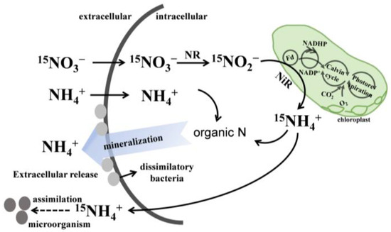 Hypothesized nitrogen metabolism in algal cells includes the process of NO3− reduction (NO3− → NO2− → NH4+), release and mineralization of NH4+ in algae.