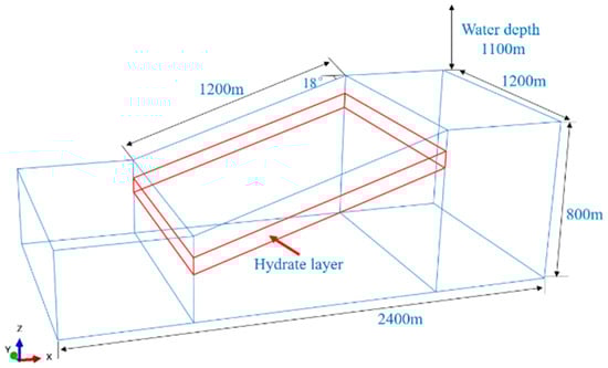 According to exploration data of the Shenhu area in the South China Sea [], the slope dip in the research area is in the range of 0~20°. NGHs are distributed in sediments with seawater depths greater than 800 m and burial depths less than 400 m. The reservoir has low permeability and the NGHs have a variable distribution, meaning that the NGH saturation is 2~48%. Supposing that the seabed temperature of the model is fixed at 4 °C and does not change with the depth of the seawater, the geothermal gradient is 35 °C·km−1 and the initial NGH saturation is 50%. The basic parameters of the model are shown in Table 1 [,].