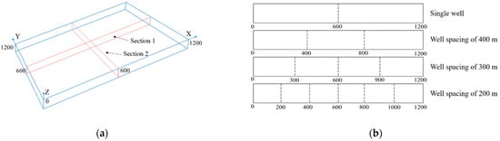 Figure 1 shows a schematic diagram of the slope model. The total length of the submarine slope model is 2400 m, the height is 800 m, the width is 1200 m, and the upper water depth is 1100 m. The length and width of the NGH layer are 1200 m. The lengths of the upper and lower horizontal sections are the same, and the values are set according to the dip angle. The NGH layer is parallel to the slope surface. The rightmost side of the model is immediately below the slope crest, and the leftmost side is immediately below the slope toe. Section 1 is set along the slope dip direction, while Section 2 is perpendicular to the slope dip direction. Section 1 in Figure 2a is parallel to the XOZ plane and at the location of Y = 600 m, while Section 2 is at the location of X = 600 m, parallel to the YOZ plane. Wells are arranged along the sections of the NGH reservoir. The transverse distances of the NGH layer along the X and Y directions are both 1200 m. Wells are uniformly arranged along the sections of the NGH reservoir according to the set well spacing. Figure 2b shows the relative locations of wells when arranging a single well and multiple wells with well spacings of 400, 300, and 200 m in Section 1 and Section 2, in which dotted lines indicate the locations of wells. X and Y indicate that wells are arranged parallel to the XOZ and YOZ planes, and the following numbers represent the number of wells, so that the design schemes are labeled X1, X2, X3, X5, Y1, Y2, Y3, and Y5. Considering the spatial symmetry of the model, test schemes X1 and Y1 are the same.