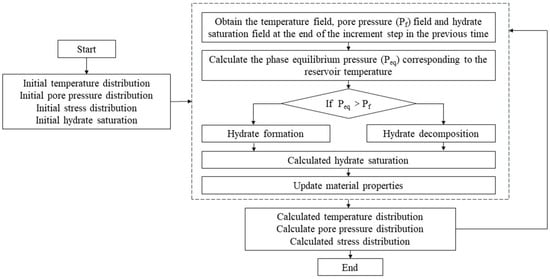 Heat absorption due to the decomposition and heat exchange of fluids in the seepage process accompanies the production process of NGHs. Therefore, the influences of heat exchange need to be considered in the energy equations. Effective thermal conductivity highly depends upon the pore-scale habit of hydrates, and also includes the influence of many factors such as the change of the relevant effective stress []. In this study, based on the characteristics of the study area and previous studies [], the selection equation is shown as Equations (7)–(9):