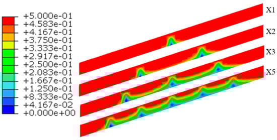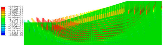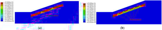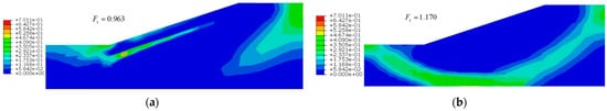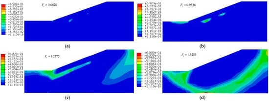 The strength reduction method was first proposed by Zienkiewicz et al. [], and strength reduction is defined as the ratio of the maximum shear strength that can be provided by soil to the actual shear stress produced by external loads in the slope when the remaining external loads remain unchanged. The strength reduction method is characterized by the advantages of a clear physical meaning and simple calculation. Therefore, this method was used to analyze the stability of submarine slopes following the principle of calculating the shear strength of soil corresponding to different reduction factors through reduction. In the model computation process, the shear strength of the soil gradually decreases with an increasing reduction factor. If the strength of the slope’s soil fails to bear the external loads, plastic yield zones form, and the soil fails.