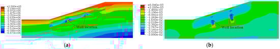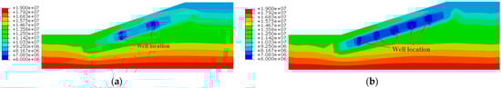 Figure 6a displays contour maps of the pore pressure along Section 1 in the slope after production using scheme X2 under 6 MPa for 720 d. In the figure, the pressure drop spreads radially around the wellbore, thus forming a cylindrical high-pressure-drop region with the wellbore as the axis and a radius of 50 m. Because the effective porosity and permeability of the NGH reservoir increase significantly after NGH decomposition and production, the pore pressure propagates anisotropically in the slope, and the propagation velocity of the low pressure in the NGH reservoir is much faster than that in the overlying and underlying strata. Figure 6b shows contour maps of the pore pressure using scheme X5 under the same conditions, and its comparison with Figure 6a reveals that the pressure drop of each well propagates in the same manner, while the superimposed effect of the pressure drop is enhanced with the narrowing of the well spacing. Moreover, a comparison of the contour maps of the pore pressure and the NGH saturation also shows that the NGH decomposition zone is located within the high-pressure-drop range of the pore pressure and that the two have some correlations.