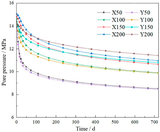 Monitoring points that are 50, 100, 150, and 200 m from the right wellbore (at X = 800 m) are set down the slope (−X direction) and perpendicular to across the slope (Y direction). Figure 7 illustrates the change curves of the pore pressure at each monitoring point with time. Within the initial 200 d of depressurizing production of NGHs, the pore pressure in the surrounding formations of the well drops rapidly. As depressurizing production is prolonged, the decreasing trend of the pore pressure gradually tends to stabilize. Moreover, the magnitude of the pressure drop decreases with increasing distance to the wellbore. By comparing the pore pressures at monitoring points the same distance from the well but in different directions, the pore pressures in different directions are found to differ only slightly at distances of 50 and 100 m; the pore pressure in the X direction is lower than that in the Y direction when the distance is 200 m. This is because of the influences of the superimposed effect of the pressure drop caused by depressurizing production of the left well.