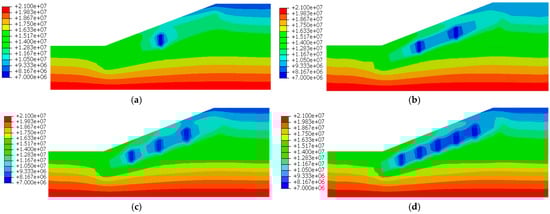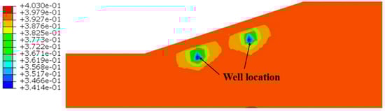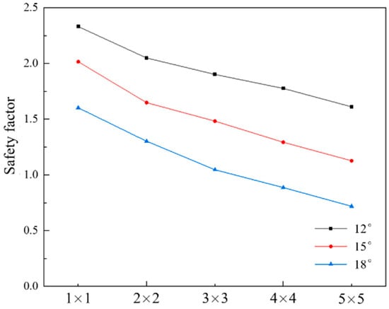 Figure 28 compares the safety factors under various schemes, and a slope model with the 5 × 5 well pattern is added. The results show that the slope dip has a large influence on the slope stability. The slopes with angles of 18° and 15° show the risk of failure after production for 720 d with well spacing densities larger than 2 × 2 and 4 × 4, respectively; the slope with a dip angle of 12° still remains stable after production with a well spacing density of 5 × 5 for 720 d.