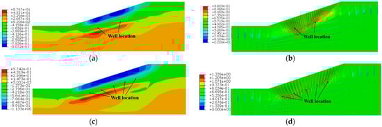 Contour maps of the vertical displacement along Section 1 of the slope at the end of production following scheme X2 are illustrated in Figure 10a. The strength of the NGH decomposition zone is lower than that of the overlying and underlying strata, which induces the settlement of the overlying strata and lifting of the underlying strata. Figure 10b shows contour maps of the total displacement vector along Section 1 of the slope when using scheme X2. The location of vector lines represents the location distribution of displacement in the slope, and the magnitude of displacement is indicated by the length and color of vector segments. Figure 10c,d displays the contour maps of the vertical displacement and total displacement vector under scheme X5. Compared with scheme X2, the decrease in the well spacing under scheme X5 results in enlargement of the region of the slope with formation deformation, which is more likely to induce submarine landslides.