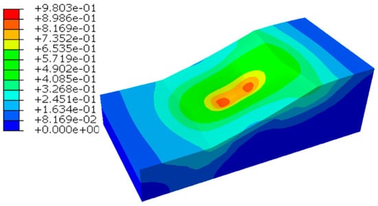 Contour maps of the total displacement of the slope with a dip angle of 18° after finishing production using the 4 × 4 well pattern are shown in Figure 29. Different from the well layout along a certain section, the depressurizing production of well patterns causes the upper part of the NGH reservoir to show a trend of overall settlement, and an obvious funnel-shaped depression area does not appear on the seabed surface.