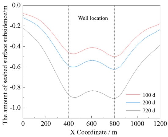 Figure 12 illustrates the displacement curves of the submarine slope surface at different production times under scheme X2. Affected by the slope dip, the settlement curves of the seabed surface are not symmetric about the wells, and the settlement above the wells is largest. A comparison of the settlement curves at different times reveals that the settlement rate of the seabed is large in the initial production stage and that the maximum settlement reaches 0.504 m after production for 100 d. Later, the settlement rate of the seabed gradually decelerates, and the maximum settlement reaches 0.913 m after 720 d of production. Therefore, close attention needs to be paid to the monitoring of seabed settlement in the initial production stage in practical engineering, and preventive measures should be taken.