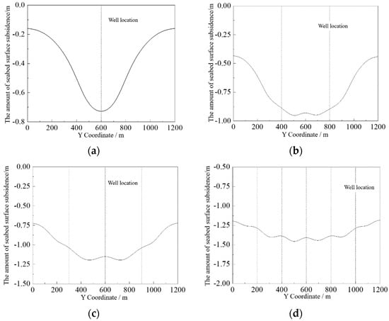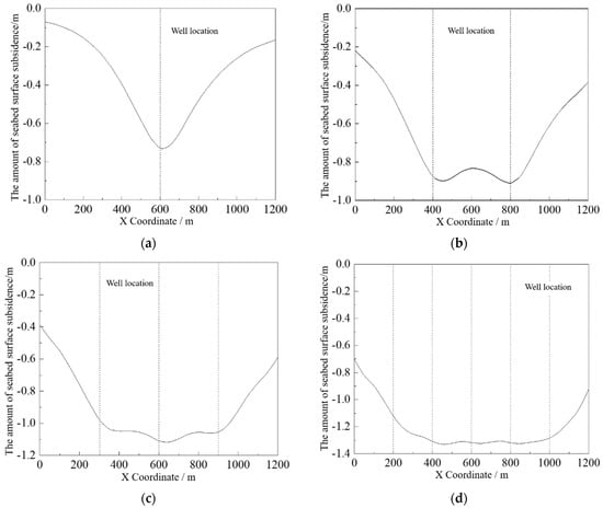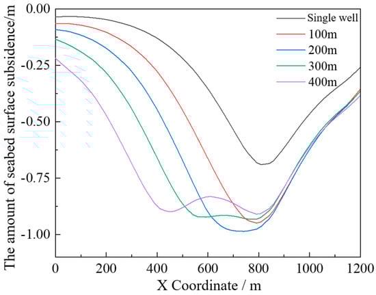 The settlement curves of the seabed surface under various schemes after production for 720 d are illustrated in Figure 32. The maximum settlement under single-well production, which is 0.691 m, is the smallest among the tested schemes. The maximum settlement is 0.952, 0.986, 0.933, and 0.913 m when the well spacing is 100, 200, 300, and 400 m. With the widening of the well spacing, the maximum seabed settlement first enlarges and then reduces. This is because the high-pressure-drop range of a single well is 50 m and, influenced by the superimposed effect of pressure drops and the lifting of underlying strata in the highly decomposed zone, the settlement is maximum when the well spacing is 200 m.