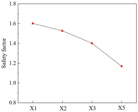 Figure 24a compares the maximum settlement of the seabed surface when arranging wells along and perpendicular to the slope dip direction. It can be seen that the range of large settlements is wider when arranging wells perpendicular to the slope dip direction under conditions of the same well spacing. Seabed settlement is more serious when arranging wells perpendicular to the slope, which may induce a greater risk of submarine landslides. Figure 24b illustrates the safety factors of the slope after production for 720 d under various schemes when arranging wells perpendicular to the slope dip direction, and the schemes are listed in descending order of the safety factor as Y1, Y2, Y3, and Y5. The slope safety factor decreases as the well spacing is narrowed, which leads to a gradual increase in the landslide risk of submarine slopes. The safety factor must be larger than 1.2 in engineering, and the safety factor of scheme Y5 is less than this value, so there is a risk of failure. By comparing the safety factors of schemes with the same well spacing and different well directions, it is found that the slope is more stable when wells are arranged along the slope dip direction.