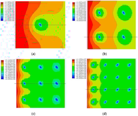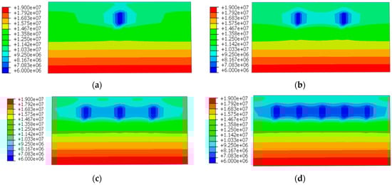 Pore pressure contour map of different well patterns. (a) V1 × 1. (b) V2 × 2. (c) V3 × 3. (d) V4 × 4.