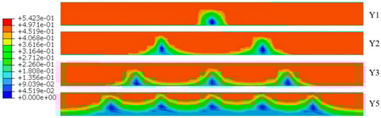 Figure 20 and Figure 21 show contour maps of the pore pressure and saturation under schemes Y2, Y3, Y5, and Y1. Similar to the well layout along the slope dip direction, perpendicular to the slope dip direction, the production trends are also similar. With the reduction in the well spacing, the superimposed effect of the pressure drop in regions between wells is enhanced, and the lower boundary of the NGH reservoir in the region between wells begins to be decomposed under scheme Y5.