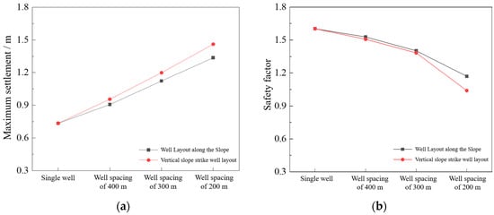 Comparison of the maximum settlement and safety factor of each scheme. (a) Maximum settlement. (b) Safety factor.