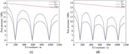 Taking the slope with a dip angle of 12° as an example, Figure 25 shows contour maps of the pore pressure when the NGH reservoir is viewed from above and Figure 26 illustrates the pore pressure curves at different times corresponding to the dotted lines in the contour maps. The propagation range of the production pressure of each well is basically the same. In the initial stage of production, the pore pressure propagates fast, while the propagation velocity decreases in the late stage. The high-pressure-drop region is still limited to a small cylindrical range of 50 m around the wellbore after production for 720 d. With the increase in the well spacing density, the superimposed effect of the pressure drops of the production wells is enhanced, and the pore pressure in the regions between wells reduces significantly.