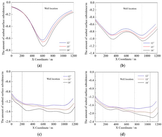 According to geometric symmetry, the settlement curves of the seabed surface on the section of wells parallel to the XOZ plane are the same. Figure 27 illustrates the settlement curves of the seabed surface on the section of wells parallel to the XOZ plane under various schemes. When the well spacing density is the same, the settlement increases with increasing slope dip. Under the same slope dip, the settlement increases with increasing well spacing density. The maximum settlement is 0.735, 1.059, 1.688, and 2.206 m under schemes V1 × 1, V2 × 2, V3 × 3, and V4 × 4, respectively, when the slope dip is 18°. Influenced by the slope dip, the maximum settlement occurs slightly above the locations of the wells. As the slope dip increases, the deviation from the location of the maximum settlement to the locations of the wells grows, and the increase in the settlement in the upper part of the slope is more obvious than that in the lower part. Therefore, the exploitation of NGHs should fully consider the geological characteristics of the target area and prioritize the arrangement of wells in the upper part of the slope.