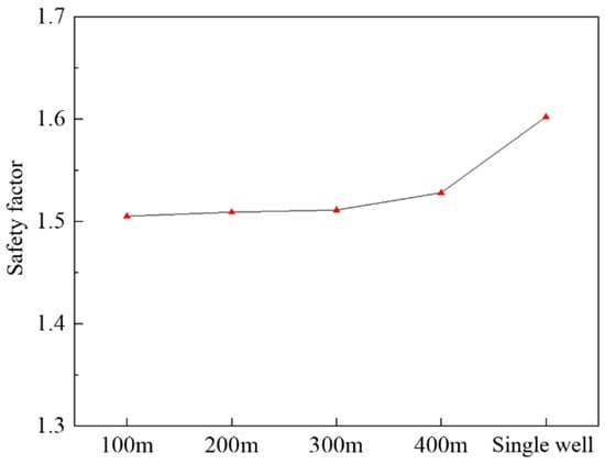 Figure 31 shows the safety factors of the slope under various schemes. Under different well spacings, the safety factors under the double-well production scheme differ slightly. Within the range of 100~400 m, the larger the well spacing is, the greater the safety factor of the slope and the more stable the slope. The safety factor of the single-well model is 1.6023, which indicates that it is more stable than the double-well model. This is because production is influenced by the number of production wells: the NGH decomposition range under single-well production is smaller than that under double-well production.