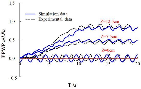 In this part, the experimental findings of Sumer et al.’s reservoir trial [12] are used to validate the model’s accuracy and numerical analytic methodologies. Figure 1 depicts the modeling and experimental results of EPWP (excessive pore water pressure at three depths, Z = 0 cm, 7.5 cm, and 12.5 cm). It can be shown that the mathematical findings match the tests in terms of EPWP buildup at various depths as well as EPWP vibration following liquefaction. From a holistic perspective, this model effectively simulates the trends and magnitudes of experimental data, exhibiting high accuracy. The differences between simulated results and experimental data, particularly at depths of 7.5 cm and 12.5 cm, are shown in Figure 1. The main reasons include the following: The wave generator cannot produce ideal regular waves. Model experiments are subject to boundary effects, and currently, these effects cannot be completely eliminated. Boundary effects are also difficult to quantify. In this finite element study, the model size reaches 100 m with the aim of minimizing the influence of boundary effects as much as possible.
