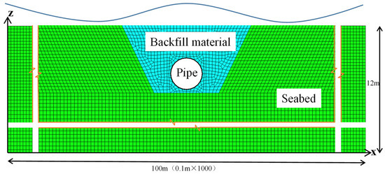 Fully buried pipelines are typically distributed along the coast. Therefore, this study employed actual observed wave data characteristic of ocean stations. The specific load parameters are as follows: wave height H = 1 m; water depth d = 10 m; wave period T = 5 s; the velocity of the current u = 1 m/s. As obtaining soil samples offshore is very challenging, the soil parameters in this study were chosen from widely cited standard sand parameters in the literature [28]. The Toyoura sand, which is widely applied to the liquefaction related model and element tests, simulates the sandy seabed. The parameters of the backfill soil have the same properties as the original seabed soil, except for the permeability coefficient. Table 1 displays the input parameters for numerical modeling, unless otherwise indicated. The pipeline parameters were selected based on actual engineering cases. The density of the steel pipeline is ρ = 7.85 × 103 kg/m3 and the pipeline is assumed to be filled with water (ρ = 1.0 × 103 kg/m3). The specific gravity of pipes included in the contents (the ratio of the gravity of pipes to the gravity of water) is 1.51, while the specific gravity of the seabed is 1.9.