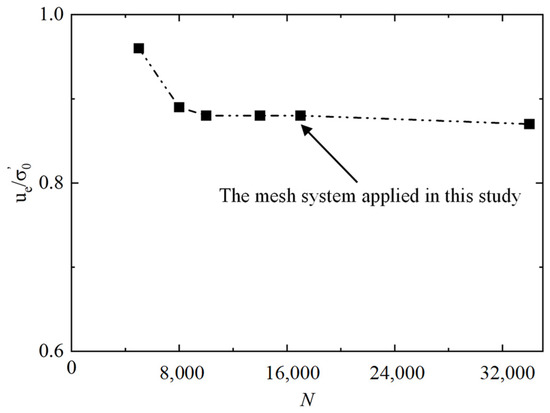 Figure 2 illustrates the seabed-pipeline model with a single layer of sandy seabed. The 2D model presents dimensions of 12 m in height and 100 m in width. The boundaries on the right and left are constrained in the X-axis direction and are limitless along the Z-axis. The lower boundary is secured in both the X and Z directions. Figure 3 depicts the maximum excess pore pressures induced by waves as well as currents on the seabed element positioned at the pipeline base, analyzed across various mesh mechanisms denoted by the entire amount of elements N, in which ue represents maximum excess pore pressure and σ’0 signifies beginning effective stress. The outcomes depicted in Figure 3 showcase that the mesh system attains a commendable level of computational precision.