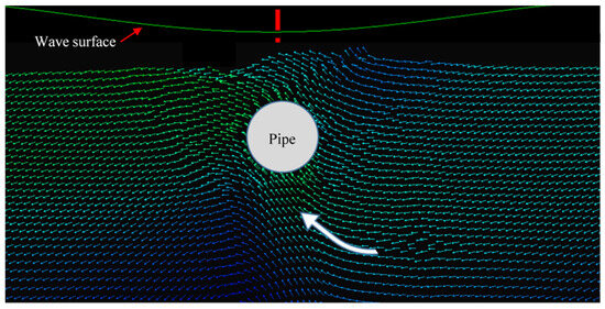 The node displacement at the bottom of the simulated pipeline is used as the analysis object to analyze the floatation of pipelines, as pipelines could be treated as rigid bodies compared with seabed soil. Figure 4 depicts the pipeline’s floating displacement over time. It is evident that when combined wave and current loadings are applied, the pipeline floats and oscillates. For the convenience of subsequent analysis, the midpoint of the displacement of each oscillation cycle is taken as the pipe displacement in one cycle. There are two stages to pipeline floatation. During the initial stage, the pipeline floats slowly with the cyclic loading. When the loading time reaches 350 s, the pipeline floating displacement reaches the inflection point and enters the second stage, and the floating displacement increases rapidly. This agrees with results of wave flume experiments by Sumer et al. [44], and existing experiments show that pipelines will eventually float to the seabed surface. According to Figure 5, the displacement vectors of the seabed are changed by the pipeline. The displacement vectors of the soil above the seabed pipeline exhibit significant undulations, which indicates substantial influence by wave-induced dynamic loads. The soil located in front of and beneath the pipeline exerts an upward-angled thrust on the pipeline. The overall horizontal displacement direction aligns with the water flow direction.