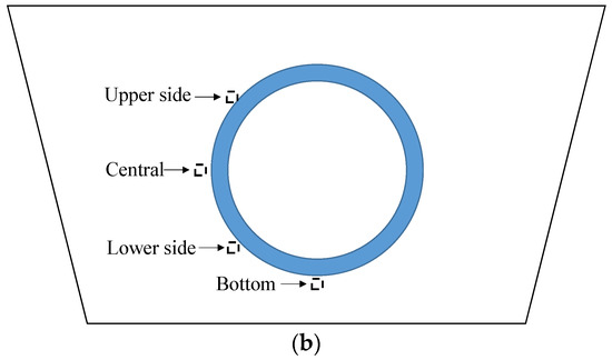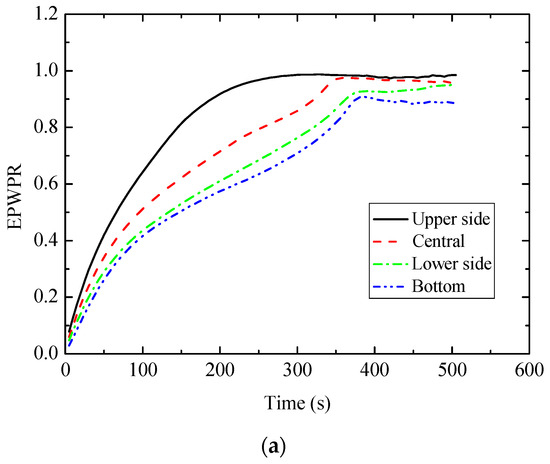 Figure 7a summarizes the temporal progression of the EPWPR for soil elements at various positions encircling the pipeline. Positions of these elements are shown in Figure 7b. It can be observed that the upper EPWPR develops the fastest, followed by the central, lower, and bottom sections. As the loading time progresses, the difference in EPWPR between the upper section and other areas gradually increases. This indicates that the buoyant force exerted on the pipeline continues to increase. At 350 s, the soil in the middle begins to liquefy, and the pressure of the soil on the upper part of the pipeline drops to 0, which causes the pipeline to rise faster. Meanwhile, an inflection point appears on the floating displacement curve of the pipeline. This is because after the pipeline floats, there is a redistribution of stress in the surrounding soil, leading to subsequent stabilization.