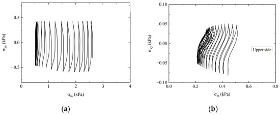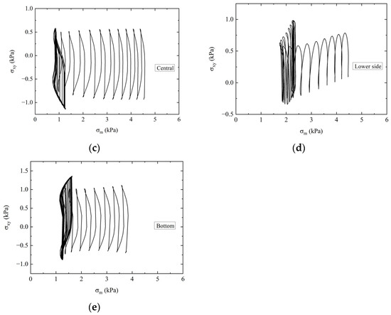 The effective stress path of seabed element shows that shear stress σxy oscillates under cyclic wave–current loadings, and the mean effective stress σm reduces. The effective stress path finally attains a stable state called cyclic mobility, which is a characteristic mechanical feature of liquefied soil. Compared with the seabed element, the effective stress path of upper side soil element surrounding the pipe slopes to the right, which means that the mean effective stress σm raises the shear stress σxy under the wave and current loadings. This is caused by boundary constraints provided by the pipeline, which strengthen soil around the pipeline, accelerate the dissipation of excess pore water pressure, and increase σm. The effective stress path of the soil element in the lower part of the pipeline is similar to that of the remote seabed element, except for the shape at failure. From the perspective of shear stiffness, the rightward inclination of the effective stress path in the upper soil element indicates a reduction in shear stiffness. This suggests that the pore water pressure in the upper soil accumulates more rapidly than in the lower soil. Based on the final area and shape of the hysteresis loops in various sections, the inclined and thinner final hysteresis loop area in the upper soil element indicates a greater degree of softening compared to the lower soil. The analysis of the effective stress path, when combined with this study, corroborates the accuracy of the soil dynamic constitutive model selected.