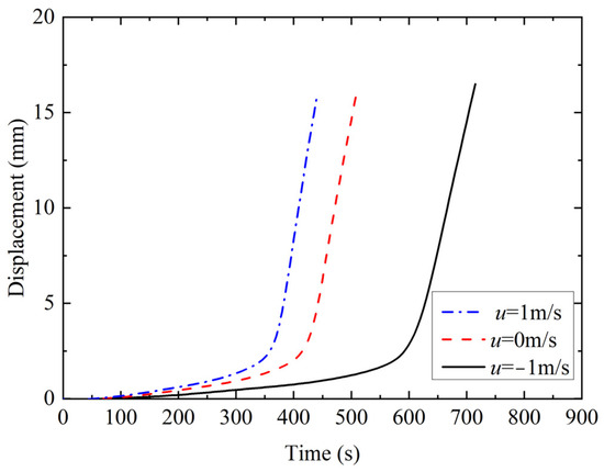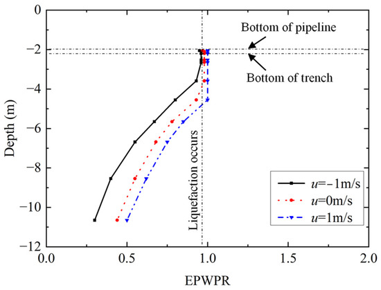 Existing research [5] indicates that a current is crucial to the dynamic response when subjected to the effects of waves and currents. Thereby, three velocities of current (u = +1 m/s, 0 m/s, −1 m/s) are picked out to explore the effect of currents on the pipeline’s floatation. In the case where u = 0, there is no current; for u < 0, the current opposes the direction of the wave; and for u > 0, the current aligns with the wave’s direction. The temporal records of the pipeline’s floating displacement at varying current velocities are presented in Figure 9. All the floatation of the pipeline goes through two stages, the steady rise stage and the accelerated rise stage. According to fluid mechanics theory, the buoyant force exerted by fluid flow on the pipeline is directly proportional to the square of the flow velocity. The higher the fluid flow velocity, the greater the propensity for pipeline buoyancy to occur. The results show that the floating displacement for u = +1 m/s is larger than that for u = −1 m/s, because the current velocity travelled in the wave’s direction increases the wave pressure transmitted to the seabed, accelerating the liquefaction of the soil surrounding the pipeline. As a result, the buoyant force acting on the pipeline increases, leading to flotation. The distributions of the maximum EPWPR below the pipeline (specifically along the vertical line across the center of the pipeline) under various current velocities are shown in Figure 10. The maximum EPWPR of the soil continues to decrease as the depth increases. As the depth of the soil layer increases, the energy transmitted by wave and currents continuously attenuates, consequently diminishing its effect on pore pressure. In addition, the increase in current velocity leads to higher EPWPR, which indicates deeper liquefaction range.