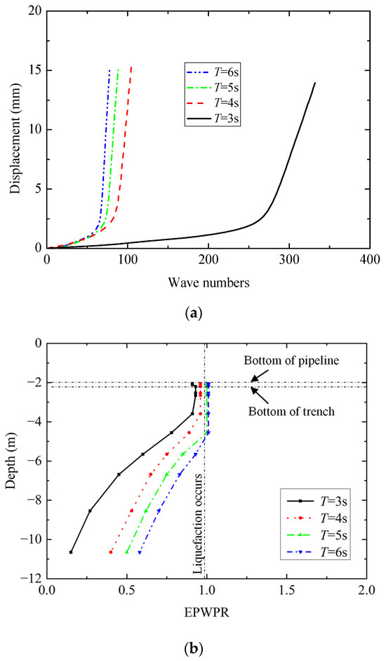 Generally, wave characteristics have a considerable influence on seabed dynamic response. Wave period (T) can influence the effective stress and excess pore water pressure in the seabed by affecting wave length (L), and wave height (H) is able to directly affect the wave pressures on the seabed. Parametric research is performed to examine the impact of wave period (T) on the floatation of pipeline with wave period (T) ranging from 3 s to 6 s with a 1 s gap. Figure 11 shows a visual representation of the pipeline’s floating displacement over time and distributions of the maximum EPWPR below the pipeline with different wave periods (T). The findings indicate that an increase in the wave period leads to a rise in the pipeline’s floating displacement and, consequently, an increase in the wave pressures exerted on the seabed. As the wave period grows, so too does its influence on the maximum EPWPR. However, as the wave period increases, its effect on the seabed does not proportionally increase. Instead, it undergoes a continuous weakening process. Figure 11b also demonstrates that the maximum EPWPR of the trench soil is lower than that of the natural seabed below the trench with a wave period of three seconds. This is because the permeability of the trench is higher than that of the seabed, indicating that increasing permeability coefficient of the trench can slow down the liquefaction of the soil around the pipelines.