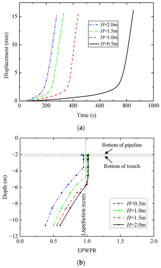 Floating displacement and MAX EPWPR time series for pipelines under various water height. (a) Time histories of floating displacement; (b) Distributions of the MAX EPWPR.