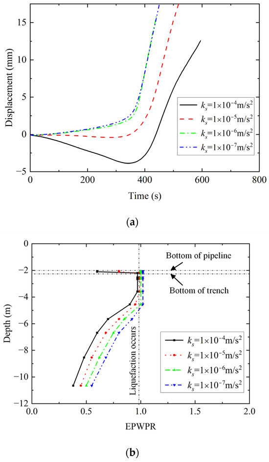 Permeability coefficient stands out as a crucial soil parameter in the seabed dynamic reaction analysis. It is critical to the development of EPWPR, with an important effect on seabed liquefaction. In theory, the higher the permeability coefficient of soil, the faster the dissipation of pore water pressure within the soil, resulting in a slower accumulation of EPWPR and making liquefaction less likely to occur. To explore the impact of permeability coefficient on the floatation of pipelines, various permeability coefficients of the trench soil (ks =1 × 10−4 m/s, 1 × 10−5 m/s, 1 × 10−6 m/s, 1 × 10−7 m/s) are examined.