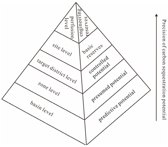 Currently, the assessment of saline aquifer sequestration potential in various countries typically involves a tiered evaluation method. Different assessment methods and parameters are utilized to evaluate the carbon sequestration potential at different levels. This paper categorizes the evaluation of the carbon sequestration potential of the saline aquifers in the Yinggehai–Qiongdongnan Basin into five stages. The corresponding types of sequestration potential are predictive potential, presumed potential, controlled potential, basic reserves, and engineering reserves, as shown in Figure 1.