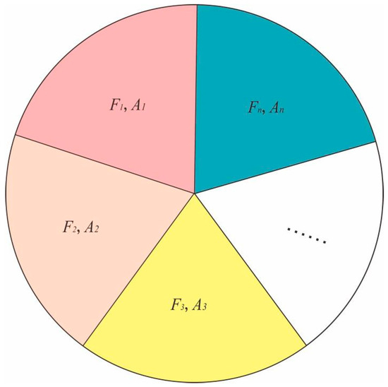 The sand-to-shale ratio of the stratum is a key parameter in the evaluation of its potential. Drilling data from marine areas show that various sedimentary facies belts exhibit different sand-to-shale ratio values. In this evaluation, a calculation model is established for various types of sedimentary facies and their sand-to-shale ratios, taking into account the sedimentary facies plan of the basin and the zone as a constraint. This model considers the weight in the evaluation unit. The weight value is obtained through drilling data calculation, as illustrated in Figure 3. In the model, various colors represent distinct sedimentary facies types. Fn denotes the percentage of sandstone thickness drilled in each sedimentary facies belt, while An represents the area of each facies belt.