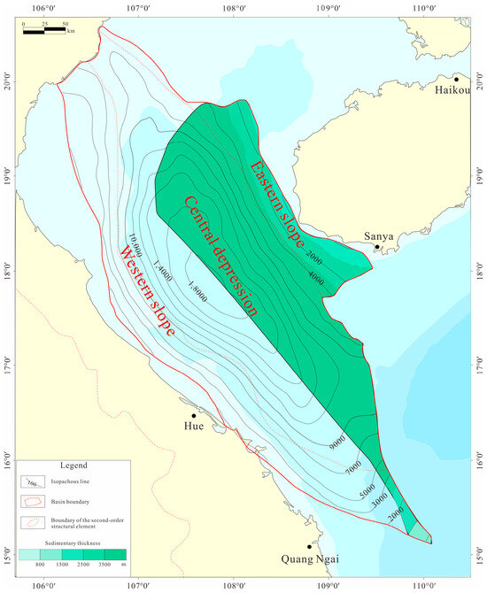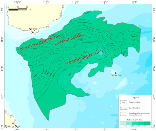 Map of Cenozoic thickness in the Qiongdongnan Basin.