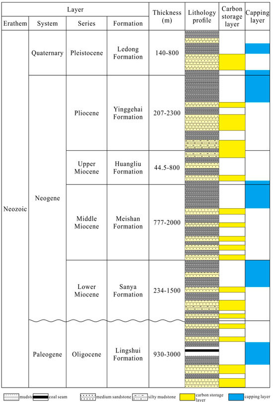 The Yinggehai Basin is situated at the northern edge of the South China Sea, near Hainan Province, covering an area of approximately 11.5 × 104 km2. The calculated area is 4.7 × 104 km2, and the average water depth is approximately 50 m. The thickness of the Cenozoic strata ranges from 2070 to 18,000 m (Figure 4). Within the stratigraphic interval of an 800 to 3200 m depth, three sets of storage–cap rock combinations are mainly developed (Figure 5). Among these, the coastal and deltaic sandstone of the Sanya Formation are effective storage layers with an average porosity of 13.9%, and the overlying upper mudstone of the Sanya Formation serves as the cap rock. The coastal and deltaic sandstone of the Huangliu Formation and the turbiditic sandstone are good storage layers with porosities between 16% and 22%, and the overlying Yinggehai Formation mudstone serves as the cap rock. The deltaic and turbiditic sandstone of the Yinggehai Formation are high-quality storage layers with porosities between 20% and 30%, and the overlying upper mudstone of the Yinggehai Formation serves as the cap rock. The basin experiences weak seismic activity and exhibits good crustal stability.