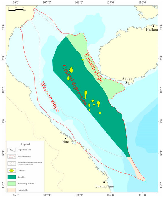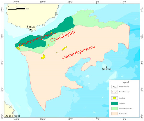 The basin is generally in the early stages of natural gas reservoir development [41,42]. As of 2021, there are 84 wells in the basin, with significant variations in water depth, short transportation distances, and locally comprehensive engineering data. The basin-level suitability evaluation result is moderately suitable (see Figure 9). The zone-level evaluation results are as follows: the northern depression is “suitable”, the central uplift is “moderately suitable”, and the central depression is “not suitable”.