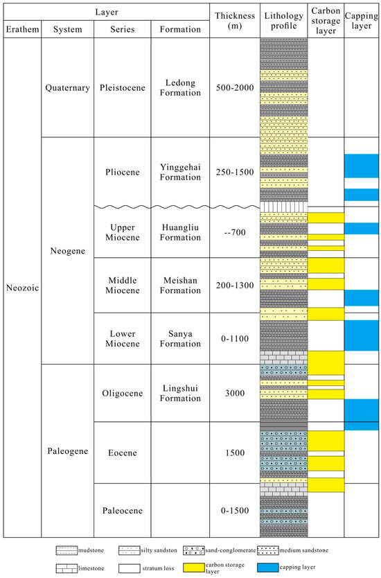 Out–of–scale columnar section of CO2 storage reservoir and cap rock in the saline aquifers of the Qiongdongnan Basin.