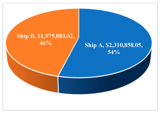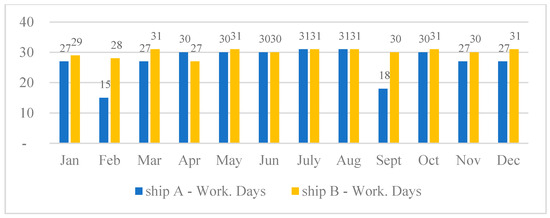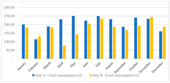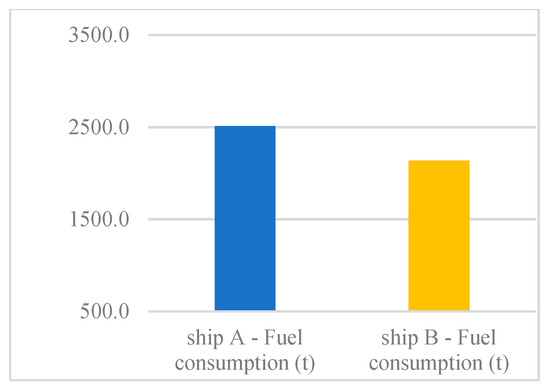 Figure 11. The total fuel consumption of ship A was 2510.96 t, and that of ship B was 2135.58 t. This means that Ship A consumed 375.38 t (17.58%) more marine diesel than Ship B (with hybrid propulsion).