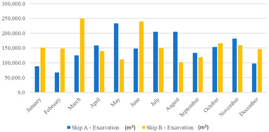 Ship B worked a total of 360 days (i.e., 37 or 10.28% more days than ship A), excavated a total of 1,884,262.00 m3 (i.e., 87,756 m3 or 4.66% more than ship A) of material and consumed a total of 2135.58 tons (i.e., 375.38 tons or 17.58% less than ship A) and 2512.45 m3 (i.e., 441.62 m3 or 17.58% less than ship A) of marine diesel respectively.