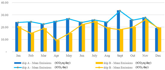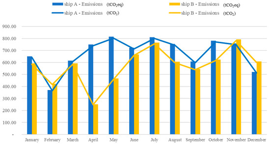 2 emissions are lower for all months and throughout the year for ship B, which has a hybrid propulsion.