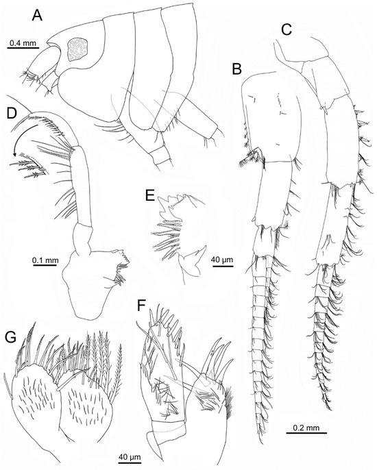 Specimens measured 2.9–6.1 mm BL (n = 27). Accessory flagellum had 3–5 articles; antenna 1 flagellum had 7–13 articles. Antenna 2 flagellum had 4–10 articles. Dorsomedial border of uropod 1 peduncle had 10–21 spines. Telson, in most specimens, had two pairs of distal spines (n = 11), some with one pair (n = 2) (Figure 10F), often broken (Figure 10G).