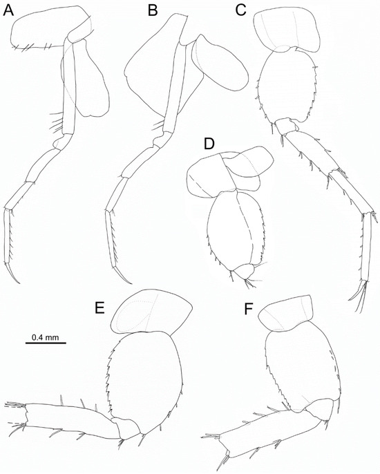 Idunella spinifera (Dauvin and Gentil, 1983). Male, Ría de Muros (NW Spain). Pereopods and coxae. (A) right pereopod 3, inner face. (B) right pereopod 4, inner face. (C) left pereopod 5, outer face. (D) right pereopod 5, proximal part, inner face. (E) right pereopod 6, outer face. (F) right pereopod 7, outer face. (A–F) same scale bar. (E,F) broken at the carpus-merus level.