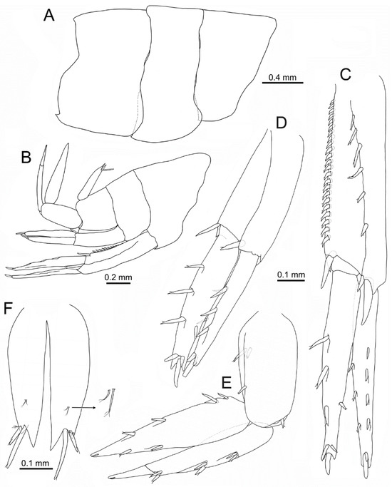 Telson (Figure 6B,F): medial cleft 0.9 times as long as telson total length; medial tooth of each lobe about twice as long as outer tooth; each lobe with two spines, medial the longest and about 2–2.2 times as long as outer spine, each pair accompanied by plumose seta; pair of short seta with two to threeapical setules on each lobe dorsal face at distal third.