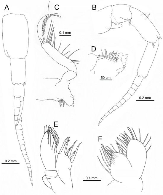 Idunella spinifera (Dauvin and Gentil, 1983). Ovigerous female, Ría de Muros (NW Spain). (A) antenna 1. (B) antenna 2. (C) right mandible. (D) right mandible, distomedial part, inner face. (E) right maxilla 1. (F) right maxilla 2. (E,F) same scale. (A,B,E,F) only some setae illustrated.