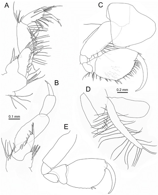 Pereopod 3 (Figure 5A): coxa nearly rectangular, 2.3 times as long as wide, with several setae on posterior margin and small tooth with one seta on posterodistal corner. Length ratio of articles from basis to dactylus about 4.7:1:2.4:1.7:2.7:1.4. Basis with several setae on distal third of anterior margin. Merus and carpus with several anterodistal and posterodistal setae, carpus also with two setae on posterior margin. Propodus with one anterodistal seta and six setae on posterior margin. Dactylus slender, slightly curved along distal half, without setae.