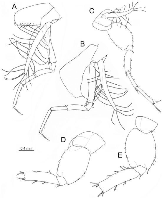 Idunella spinifera (Dauvin and Gentil, 1983). Ovigerous female, Ría de Muros (NW Spain). Pereopods and coxae. (A) right pereopod 3, inner face. (B) right pereopod 4, inner face. (C) left pereopod 5, inner face. (D) right pereopod 6, outer face. (E) right pereopod 7, outer face. (A–E) same scale bar. (D,E) broken at the carpus-merus level.