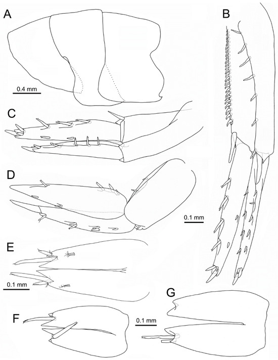 Idunella spinifera (Dauvin and Gentil, 1983). Ovigerous female (A–E), non-ovigerous females (F,G), Ría de Muros (NW Spain). (A) pleonites, left side, lateral view. (B) right uropod 1, laterodorsal view. (C) right uropod 2, laterodorsal view. (D) right uropod 3, lateral view. (E–G) telson, dorsal view. (B–D,F,G) same scale. (F,G) dorsal and terminal setae, with setules not illustrated.