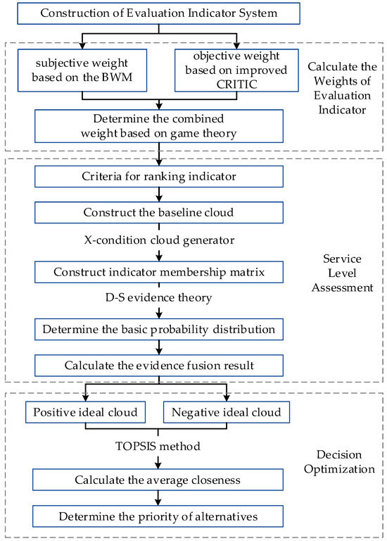Firstly, the subjective and objective weights of indicators are calculated by the Best-Worst Method (BWM) and improved CRiteria Importance Through Intercriteria Correlation (CRITIC) method, respectively, and the combined weight of each indicator is obtained by game theory. Secondly, the base cloud is constructed according to the grade evaluation criteria of the indicators, the membership degree of each indicator is calculated using the X-condition cloud generator, and then converted into the basic probability distribution through the D-S evidence theory for evidence fusion. Finally, the optimal order of the final decision is determined by the average closeness value according to the TOPSIS method.