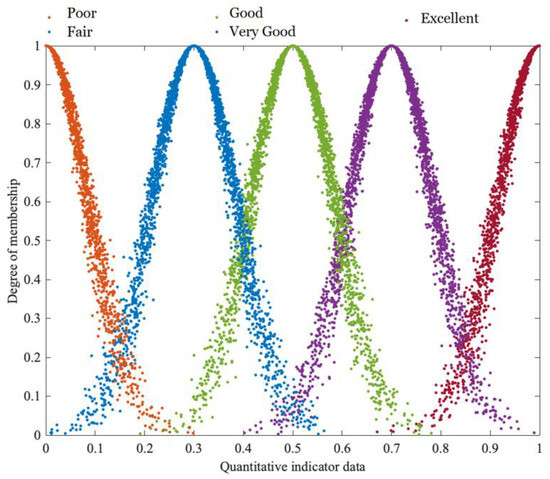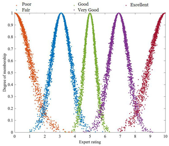 where indicates a base cloud with the “Poor” rating, , respectively, represent the expectation value, entropy and hyperentropy of the base cloud at this evaluation level; indicates a base cloud with the “Fair” rating, , respectively, represent the expectation value, entropy and hyperentropy of the base cloud at this evaluation level; indicates a base cloud with the “Good” rating, , respectively, represent the expectation value, entropy and hyperentropy of the base cloud at this evaluation level; indicates a base cloud with the “Very Good” rating, , respectively, represent the expectation value; and indicates a base cloud with the “Excellent” rating, , respectively, represent the expectation value. , respectively, represent the upper and lower limits of the evaluation interval, belong to the boundary values of the adjacent service level evaluation interval, and have the same membership degree of 0.5 for the adjacent service levels.