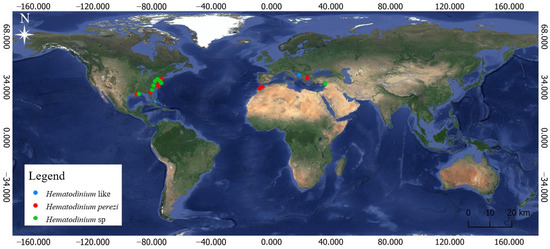 Hematodinium perezi is currently the only confirmed Hematodinium species known to be infecting Callinectes sapidus [43]. The other representative of this genus, namely Hemtodinium sp., was reported as a parasite of C. sapidus from many coastal areas in USA) [44,45,46,47,48,49,50,51,52,53], and in Turkey [54]. This one, infecting boreal hosts, particularly Chionoecetes opilio and Nephrops norvegicus (Linnaeus, 1758), has not been identified at the species level yet (Shields J.D., pers. comm.).